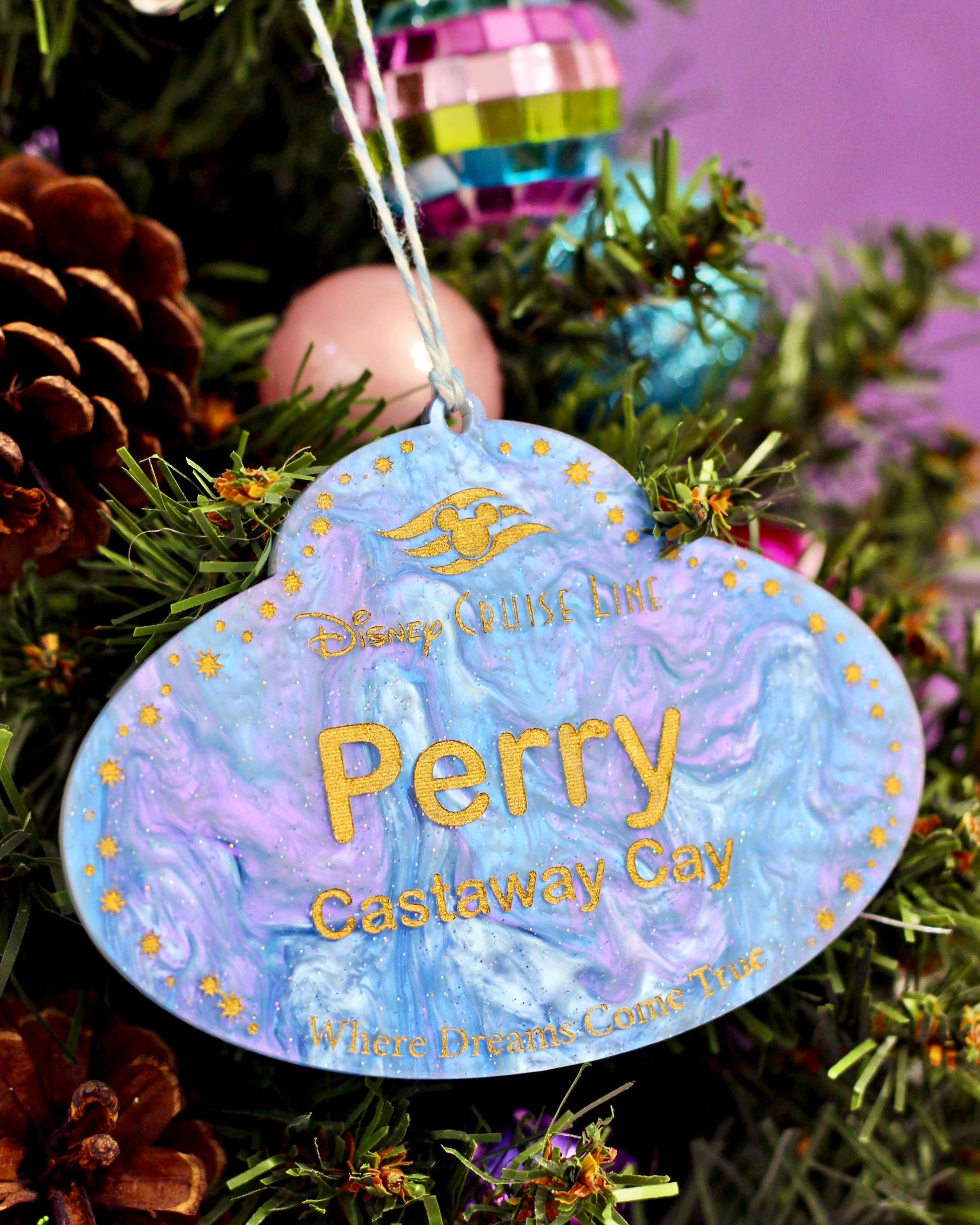 This ornament is made of hand-painted engraved marble acrylic and comes with twine.